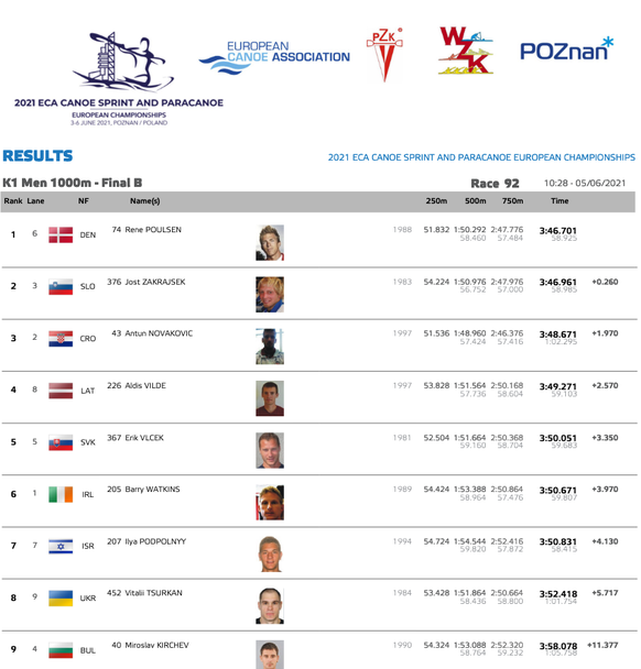 Най-добрият български каякар през последните години Мирослав Кирчев финишира на 9-о място на едноместен каяк 100 метра във Финал Б на Европейското първенство по кану-каяк за мъже и жени в Познан (Полша).