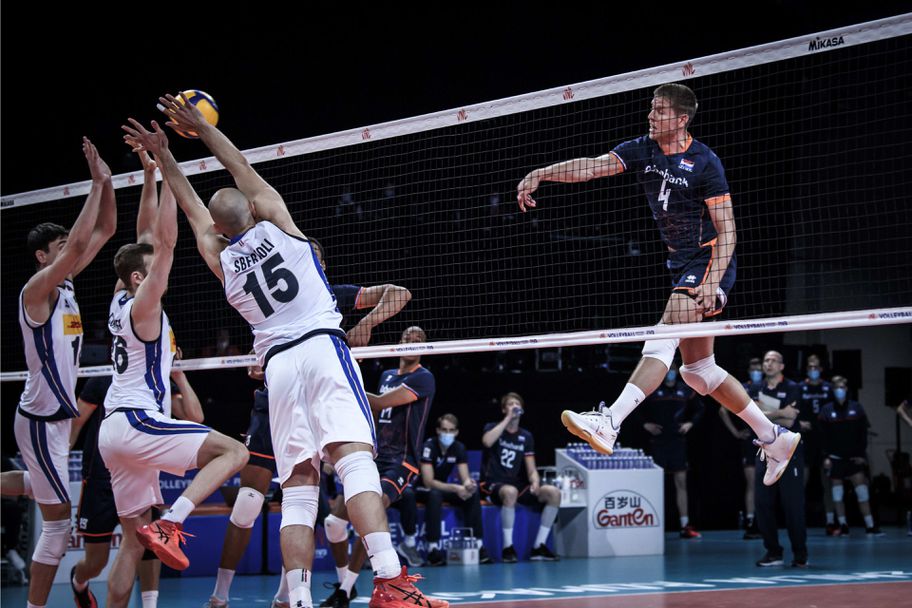 Домакините на Волейболната Лига на нациите от Италия се поздравиха с 5-а победа в турнира. Младият състав на "Скуадра адзура" даде само гейм и надигра Нидерландия с 3:1 (25:19, 25:23, 23:25, 25:21) във втория си мач от 4-а седмица на надпреварата в Римини, игран тази вечер.