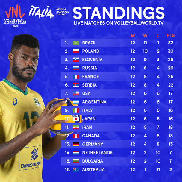 Волейболистите на Италия изненадаха един от фаворитите Франция с 3:2 (25:19, 22:25, 25:20, 21:25, 15:12) в мач от 12-ия кръг на турнира на Лигата на нациите в Римини.