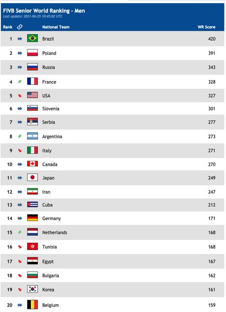 За последно възпитаниците на Силвано Пранди заемаха 14-о място, но сега с актив от 167 точки са на 18-а позиция. Лидер продължава да е тимът на Бразилия с актив от 420 точки, следван от Полша с 391 точки и Русия с 343 точки.