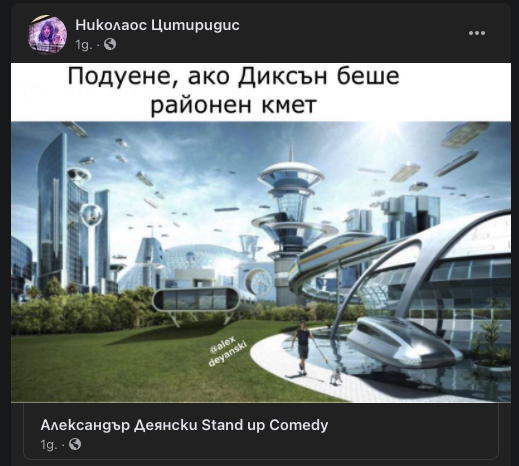 Телевизионният водещ Николаос Цитиридис сподели във "Фейсбук" колаж с футуристична картина. "Подуене, ако Диксън беше районен кмет", гласи надписът, под който се забелязват летящи автомобили.