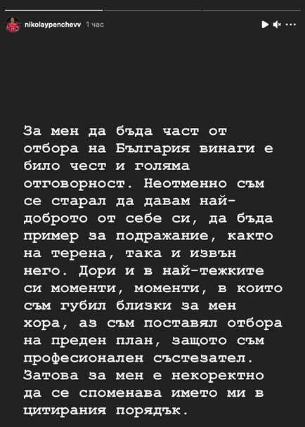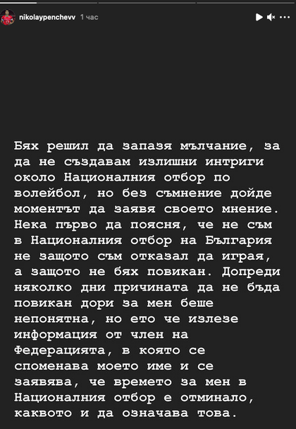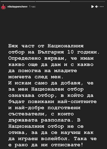 "Бях решил да запазя мълчание, за да не създавам излишни интриги около Националния отбор по волейбол, но без съмнение дойде моментът да заявя своето мнение. Нека първо да поясня, че не съм в Националния отбор на България не защото съм отказал да играя, а защото не бях повикан. Допреди няколко дни причината да не бъда повикан дори за мен беше непонятна, но ето, че излезе информация от член на Федерацията, в която се споменава моето име и се заявява, че времето за мен в Националния отбор е отминало, каквото и да означава това. За мен да бъда част от отбора на България винаги е било чест и голяма отговорност. Неотменно съм се старал да давам най-доброто от себе си, да бъда пример за подражание, както на терена, така и извън него. Дори и в най-тежките си моменти, моменти, в които съм губил близки за мен хора, аз съм поставял отбора на преден план, защото съм професионален състезател. Затова за мен е некоректно да се споменава името ми в цитирания порядък. Бях част от Националния отбор на България 10 години. Определено вярвам, че имам какво още да дам и с какво да помогна на младите момчета след мен. И искам само да добавя, че за мен Национален отбор означава отбор, в който да бъдат повикани най-опитните и най-добре подготвени състезатели, с които държавата разполага. В Националния отбор не се отива, за да се научиш как да играеш волейбол. Така че е рано да ни отписвате", написа посрещачът.