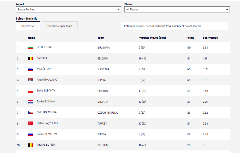 Ива Дудова е в челото на още една класация - на атакуващите, като там тя е втора със 152 точки (средно по 5,04 на гейм). Пред нея е само белгийката Каат Кос - със същия актив, но в повече изиграни срещи. Трета е Мия Шифтар.