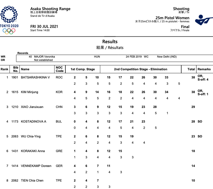 Това е втора олимпийска титла на рускинята в Токио след триумфа й на 10 метра пистолет и общо трето отличие в японската столица след среброто в смесената отборна надпревара на 10 метра пистолет. Цзяжуйсюан взе бронза с 29 точки.