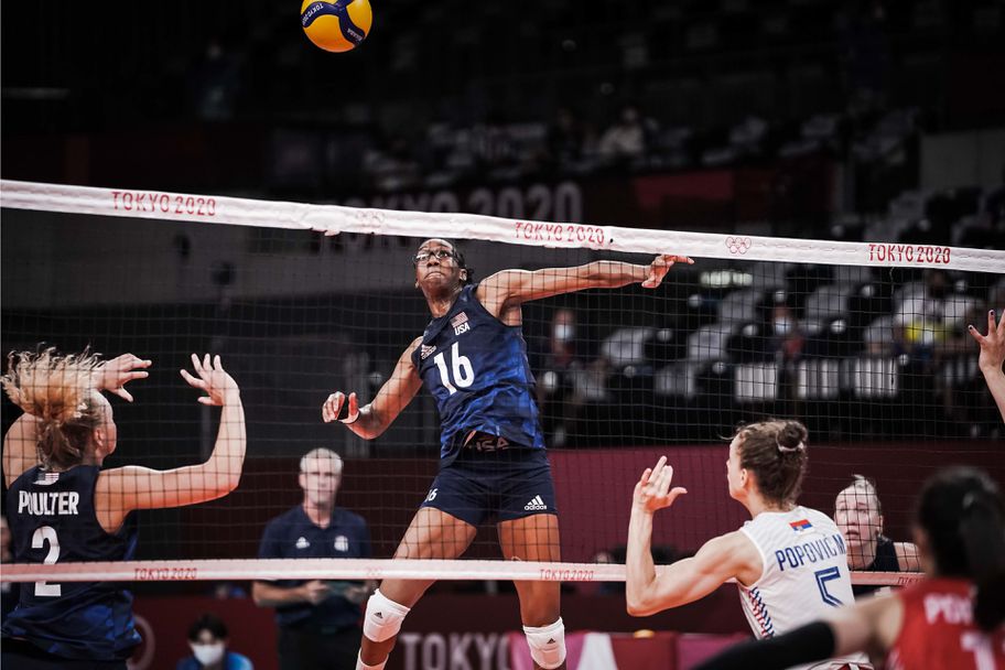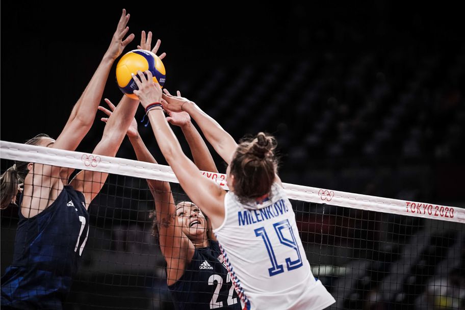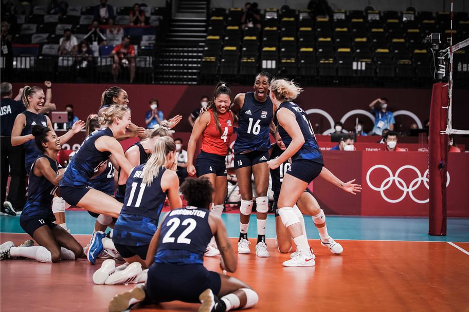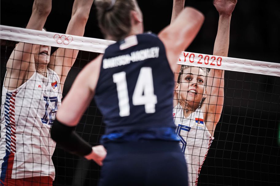 Победителките в Лигата на нациите от 2018, 2019 и 2021 година от САЩ се класираха на финала на Олимпийските игри в Токио, след като в първата полуфинална среща днес сразиха олимпийските вицешампионки от Рио 2016 от Сърбия с 3:0 (25:19, 25:15, 25:23) в „Ариаки Арена“.