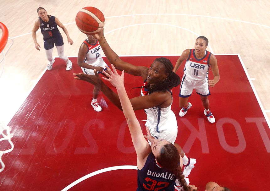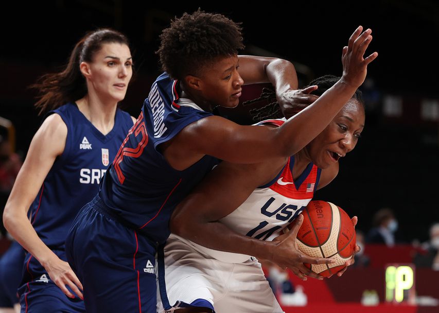 Олимпийският шампион САЩ победи европейския първенец Сърбия със 79:59 (25:12, 16;11, 17:16, 21:20) и се класира за финала на олимпийския турнир по баскетбол при жените в Токио.