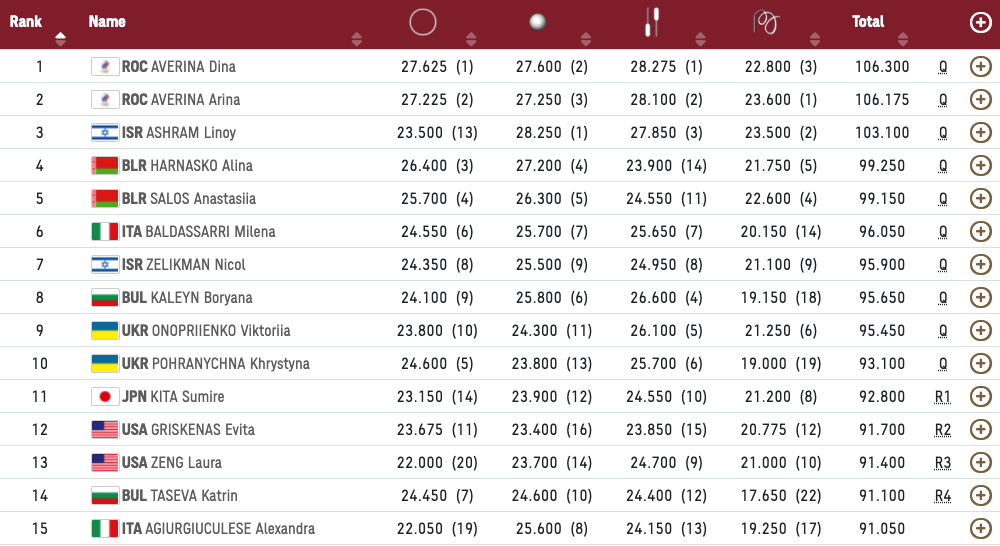 Във финала утре Калейн ще спори за отличията със сестрите Дина (106.300) и Арина (106.175) Аверина от Руския олимпийски комитет, които завършиха съответно първа и втора в днешната квалификация както и Линой Ашрам (Израел, 103.100), Алина Харнаско (Беларус, 99.250), Анастасия Салос (Беларус, 99.150), Милена Балдасари (Италия, 96.050), Никол Зеликамн (Израел, 95.900), Виктория Оноприенко (Украйна, 95.450) и Кристина Похранична (Украйна, 93.100).
