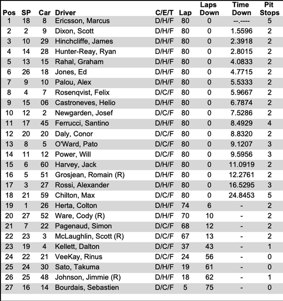 Ериксон излезе начело в 33-та обиколката, когато голяма част от лидерите спряха в бокса при петия период с кола за сигурност. От там до финала шведът контролираше развоя на събитията въпреки огромния натиск, на който той бе подложен от Колтън Херта (Andretti Autosport) и съотборника си Скот Диксън.