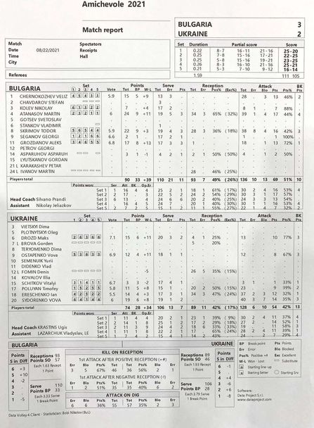 Вова Сидоренко бе най-резултатен за Украйна с 19 точки (2 аса, 3 блока, 35% ефективност в атака, - +8), а Яне Ерещенко се отличи 14 точки (1 ас, 1 блок, 32% ефективност в атака, 24% перфектно и 47% позитивно посрещане - +3). Бившият централен блокировач на родния Нефтохимик 2010 (Бургас) Максим Дрозд заби 15 точки (2 аса, 3 блока, 77% ефективност в атака - +11)