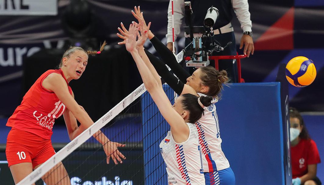 Действащите шампионки от Сърбия завършиха с 5 победи от 5 мача в своята група на Евроволей 2021. Момичетата на Зоран Терзич се наложиха изключително драматично и трудно над Русия с 3:2 (25:22, 25:19, 16:25, 24:26, 15:10) в последната си среща от Група А, играна късно тази вечер пред над 7000 зрители в зала "Щарк Арена" в Белград.