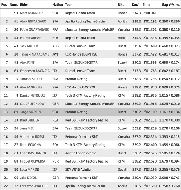Пилотът на Honda завъртя най-бърза обиколка от 2:00.941 минути, като с него той бе с 0.250 секунди по-бърз от Алейш Еспаргаро с Aprilia. Тройката с пасив от 0.360 секунди бе затворена от лидера в световния шампионат Фабио Куартараро за тима на Yamaha.