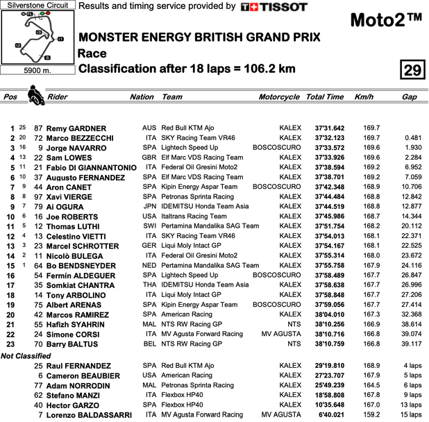 Гарднър, син на световния шампион в клас до 500 куб. см. за 1987 година Уейн Гарднър триумфира на „Силвърстоун“ след един оспорван дуел с италианеца Марко Бедзеки (SKY Racing Team VR46), който бе решен от само 0.481 секунди след 18 обиколки по трасето с дължина от 5.9 километра. По-големият плюс за австралиеца бе отпадането на неговия съотборник и основен конкурент за короната през 2021 година, който допусна грешка в бързия 12-и завой в хода на 15-ия тур.