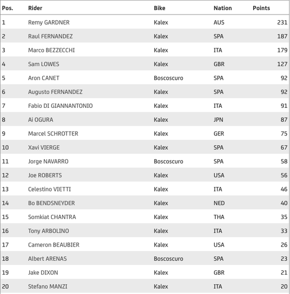 Така авансът на Гарднър на върха в генералното класиране набъбна на 44 точки спрямо Фернандес, докато вторият от днес Бедзеки се движи на трета позиция с изоставане от осем пункта спрямо испанеца.