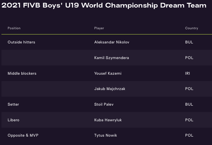 ПОЛША: Матеуш Куфка 3, Якуб Майчерак 3, Пьотър Сливка 2, Камил Шимендера 2, Кайетан Кубицки 3, Титус Новик 6, Куба Хаврилук-либеро