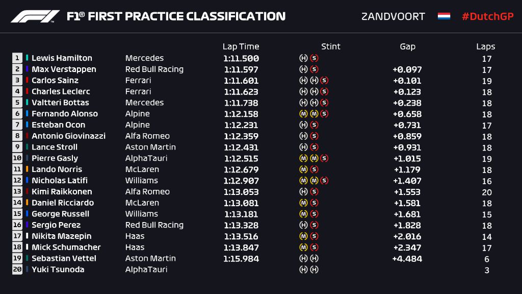 Британецът записа време от 1:11.500 в заключителните шест минути на сесията, която бе прекъсната за близо 35 заради спрелия болид на Себастиан Фетел. Двигателят на автомобила на германеца се повреди и той спря точно на излизането на първия завой на „Зандвоорт“, което на пръв поглед изглеждаше лесна работа за маршалите. Голямото забавяне бе породено от нуждата механиците на Астън Мартин да се намесят, тъй като хибридната система на AMR21 остана активна и съответно маршалите не можеха безопасно да отстранят болида.