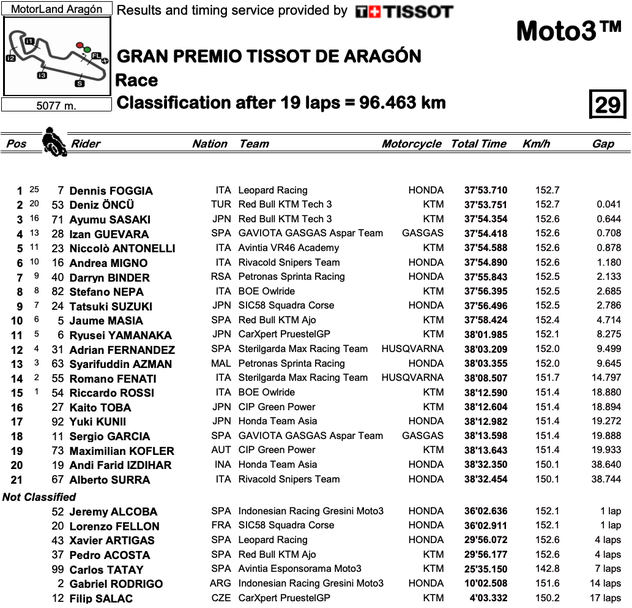 Денис Фоджа (Leopard Honda) записа своята трета победа от началото на сезон 2021 в клас Moto3 на световния шампионат по мотоциклетизъм на писта, след като триумфира в надпреварата за Гран При на Арагон.
