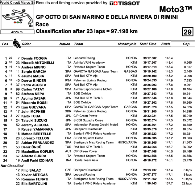 За италианеца това е втори успех на родна земя през годината след този в Гран При на Италия на „Муджело“ в края на месец май. А той стигна до него с огромна доза късмет, след като и Николо Антонели (Avintia VR46 Academy), и Романо Фенати (Sterligarda Max Racing Team) допусна сериозни грешки от първите две позиции.
