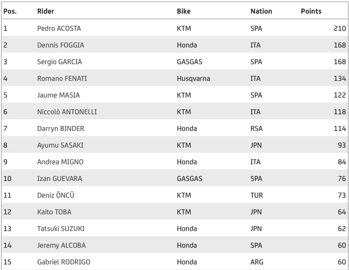 Лидерът в генералното класиране Педро Акоста (Red Bull KTM Ajo) имаше едно посредствено за своите стандарти състезание на „Мизано“, в което завърши седми. Така неговият аванс на върха на генералното класиране бе стопен на 42 точки спрямо Фоджа, който има равен актив със Серхио Гарсия (Aspar). Испанецът имаше златен шанс да се доближи до челото, но загуби темпо във финалните турове финишира четвърти.