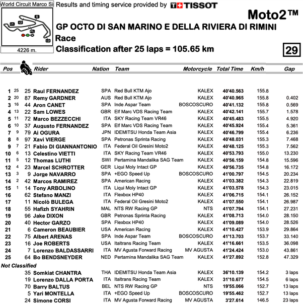 Лека неточност на Реми Гарндър (Red Bull KTM Ajo) в 11-я завой на последната обиколка позволи на неговия съотборник Раул Фернандес да запише своята шеста победа за сезон 2021 в Moto2 в надпреварата за Гран При на Сан Марино.
