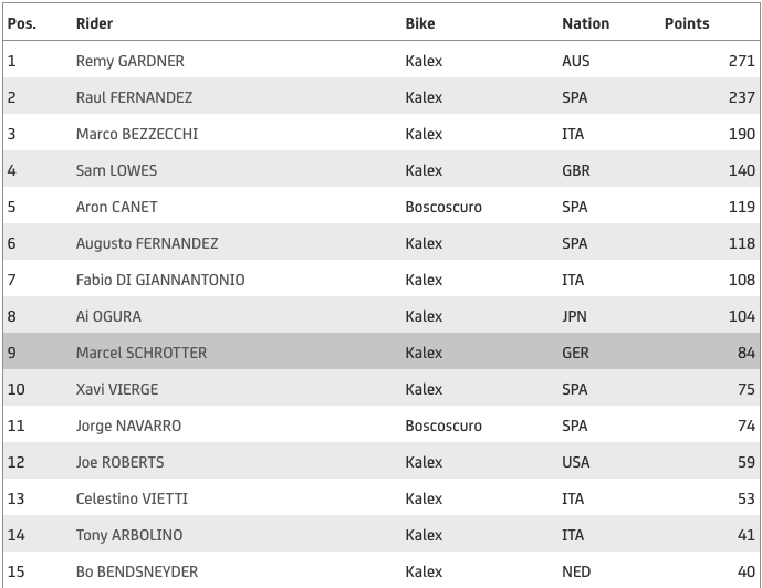 С нея той стопи аванса на Гарднър на върха в генералното класиране на 34 точки четири кръга преди края на кампанията. Трети в подреждането, но на цели 81 пункта от лидера се намира Марко Бедзеки (SKY Racing Team VR46), който финишира пети в Гран При на Сан Марино. Италианецът единствен извън пилотите на Red Bull KTM Ajo има математически шансове да грабне короната, но се нуждае от голямо чудо в оставащите стартове.