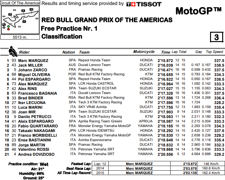 Испанецът успя да завърти тур на изсъхващото трасе „Пистата на Америките“ край Остин за 2:15.872, като по този начин той бе с 0.167 секунди по-бърз от Джак Милър с Ducati. Трети се нареди Йоан Зарко за тима на Pramac Ducati, като пасивът на французина бе цели 0.599 секунди.