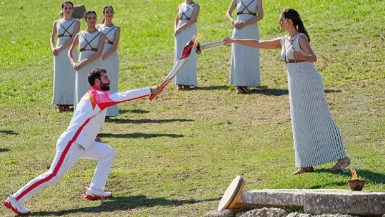 Олимпийският огън беше предаден на първия факелоносец на стадиона на древното светилище. Това е състезателят по ски-алпийски дисциплини Йоанис Антониу, който преди това участва в щафетата с факела за Игрите в Сочи 2014 и също така носи гръцкото знаме при закриването на Олимпиадата в Пьончан 2018.