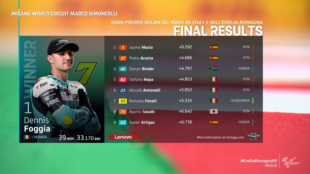Фоджа започна второто състезание за годината на „Мизано“ от 14-о място на стартовата решетка, но с едно прекрасно каране пред родна публика се добра до челото още в средата на дистанцията. След като пое водачеството десетина обиколки преди края на състезанието италианецът не погледна назад и стигна до трети успех в три старта в Италия през 2021.