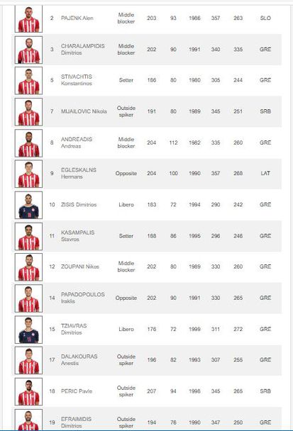 През настоящия сезон в тима на Олимпиакос играят четирима чужденци, трима от които с височина над 202 см. Съставът е подсилен от Ален Пайенк (Словения, централен блокировач, 203 см), Никола Мияйлович (Сърбия, посрещач 191 см), Павле Перич (Сърбия, посрещач, 207 см) и Херманс Еглескалнс (Латвия, диагонал, 204 см).