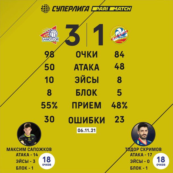 ЮГРА-САМОТЛОР: Юрий Синица 2, Назар Литвиненко 7, Руслан Галимов 11, Максим Шпилев 14, Юрий Цепков 9, Алексей Плужников 6 — Валентин Кротков-либеро (Максим Сапожков 18, Ярослав Верний, Савелий Паздняков 1)