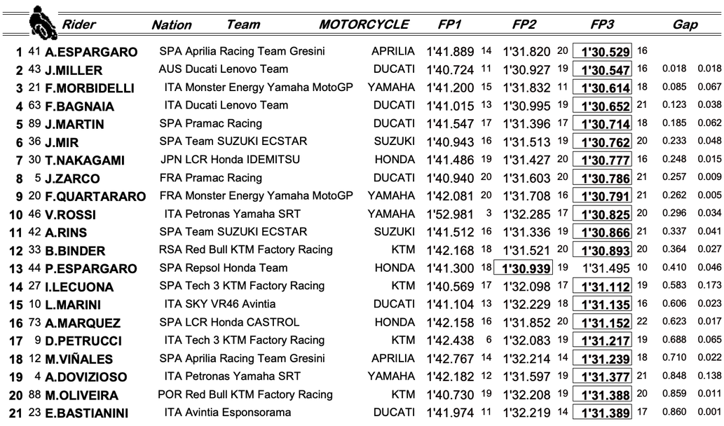 Неговият брат пък успя да завърти обиколка за 1:30.529, като по-този начин той бе с 0.018 секунди по-бърз от Джак Милър (Ducati), който бе над всички във вчерашния ден. Тройката бе затворена от миналогодишния победител в Гран При на Валенсия Франко Морбидели (Yamaha), който бе с 0.085 по-бавен от пилота на Aprilia.