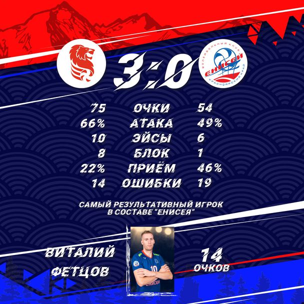 Тодор Скримов игра цял мач за Енисей и стана втори по резултатност със скромните 9 точки (2 аса, 41% ефективност в атака и 38% позитивно посрещане). Виталий Фетцов отново пък бе най-резултатен с 14 точки (1 блок, 2 аса и 52% ефективност в атака).