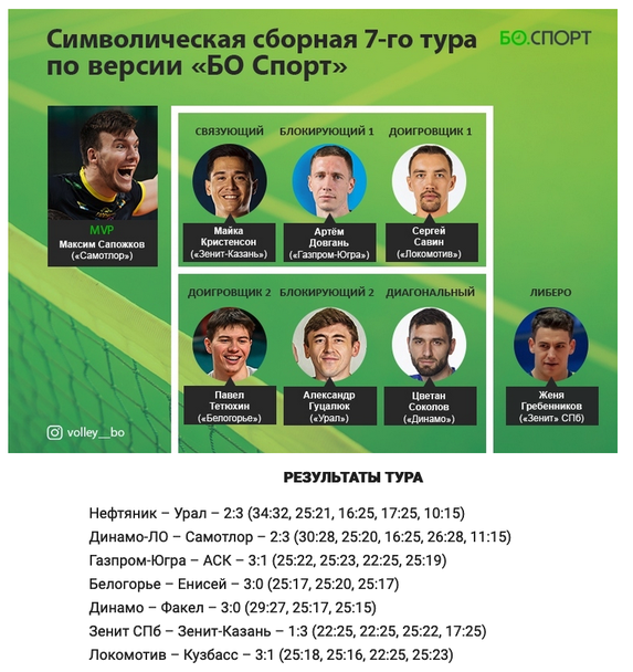 Капитанът на националния отбор на България Цветан Соколов попадна в Идеалния отбор на 7-ия кръг на волейболната Суперлига на Русия на авторитетното руско издание „БО Спорт“ .