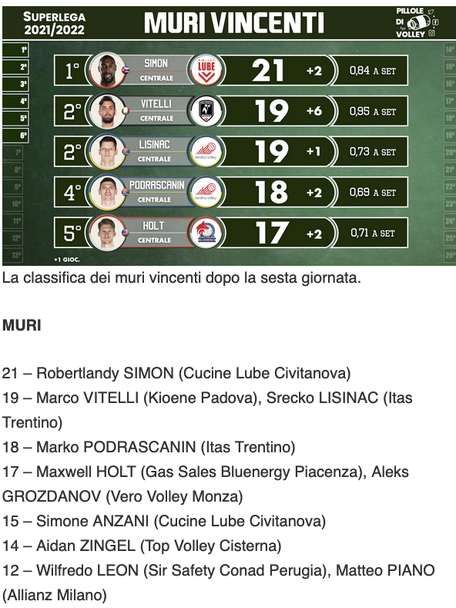 Алекс Грозданов разделя 5-ото място в класацията за най-добри блокировачи. Националът е направил 17 блокади от началото на сезона и разделя 5-ото място заедно с американеца Максуъл Холт от Пиаченца.