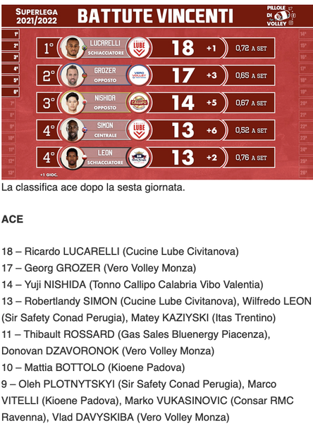 Лидер е по директни точки от сервис е бразилският нападател на Лубе Рикардо Лукарели с 18 аса. Втори е германецът от Монца Георг Грозцер със 17 аса, а трети японската сензация на Вибо Валентия Юджи Нишида с 14 аса.