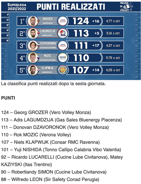 Водач в тази класация Георг Грозер със 124 точки. След него са турчинът Адис Лагумджия от Пиаченца със 113 точки, чехът Доновън Дзаворонок от Монца със 111 точки, словенецът Рок Можич от Верона с 110 точки, нидерландецът Нилс Клапвайк от Равена със 107 точки и японецът Юджи Нишида със 101 точки.