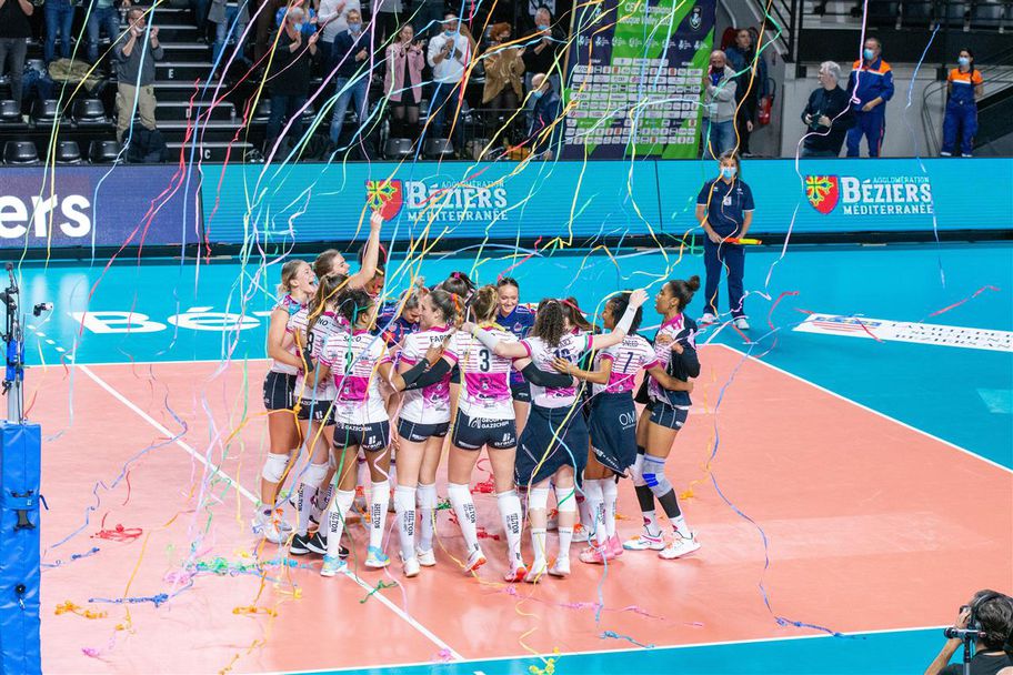 Първата част на двубоя започна равностойно и се стигна до 9:9. Безие успя да поведе с три точки при 18:15 и Борислав Крачанов поиска тайм-аут. Вицешампионът на Франция успя да вземе първия гейм след 25:21. Във втората част домакините успяха да дръпнат с три точки при 10:7. Стигна се до 15:11, а Безие взе втория и гейм след 25:20. Страхотно започна третия гейм за българските шампионки и те поведоха с 6:3, но постепенно френският тим изравни и поведе в резултата. Стигна се до 18:14, а след 25:16 Безие спечели мача в своя полза.