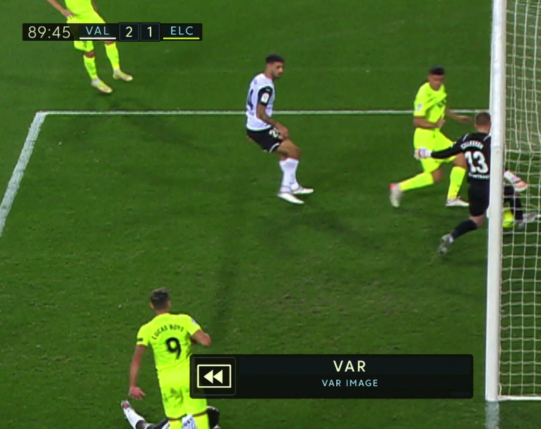 Малко след това гостите настояваха да им бъде присъдено попадение при спорна ситуация, при която останаха съмнения, че топката е преминала голлинията с целия си обем. В Испания обаче не използват технологията на голлинията, а такива положения се преглеждат от ВАР. От там прецениха, че кълбото не е пресекло изцяло линията.