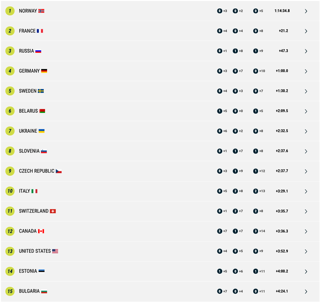 Тройката с една наказателна обиколка и общо девет допълнителни патрона затвори Русия (Василий Томшин, Даниил Серокхвостов, Александър Логинов, Едуард Латипов), като пасивът на Сборная бе 47.3 секунди. Петицата бе допълнена от Германия (Ерик Лесер, Йоханес Кюн, Роман Реес, Филип Наурат) и олимпийския шампион Швеция (Пепе Фемлинг, Мартин Понсилуома, Малте Стефансон, Себастиан Самуелсон), които използваха съответно по десет и седме допълнителни патрона и не въртяха наказателни обиколки.