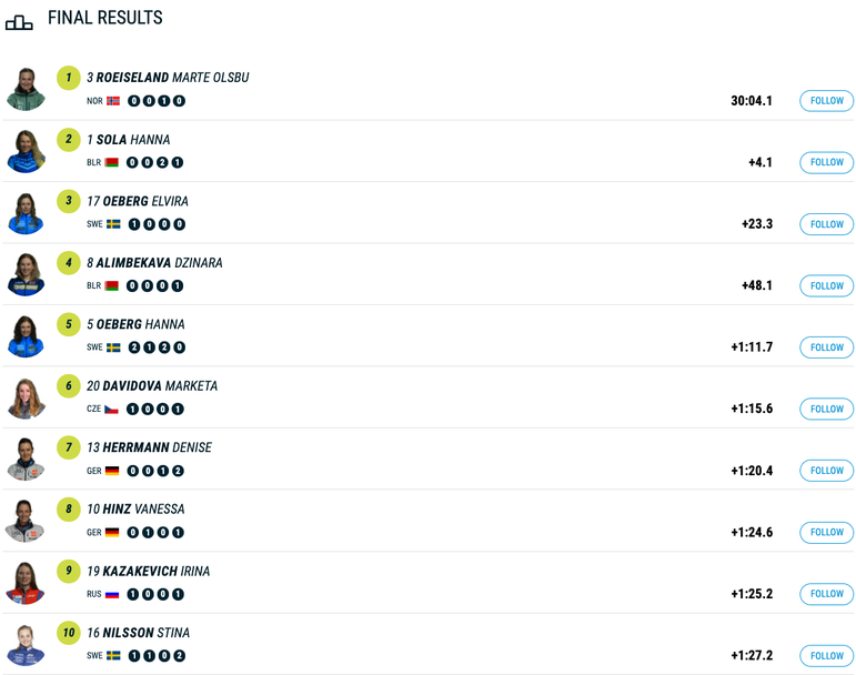 Така те започнаха последната си обиколка с разлика от 11.3 секунди в полза на белорускинята, но тя нямаше отговор на темпото на Рьозеланд, която я настигна в последните метри. Така само няколко завоя преди финала норвежката пое водачеството и в крайна сметка триумфира с аванс от 4.1 секунди. Трета днес се класира шведката Елвира Йоберг, която направи невероятно състезание, в което спечели цели 14 позиции, след само една грешка в първата си стрелба.