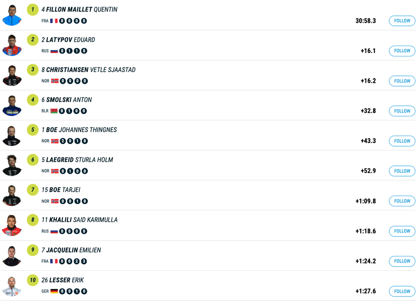 Представителят на домакините повали всичките си 20 мишени, с което спечели три позиции спрямо класирането си във вчерашния спринт. Втори на 16.1 секунди зад французина с завърши Едуарт Латипов от Русия, който допусна по една грешка във втората и третата визита на рубежа. Тройката затвори норвежецът Ветле Шастад Кристиансен, който подобно на победителя бе безгрешен в стрелбата си, но загуби финалния спринт за второто място след фото-финиш.
