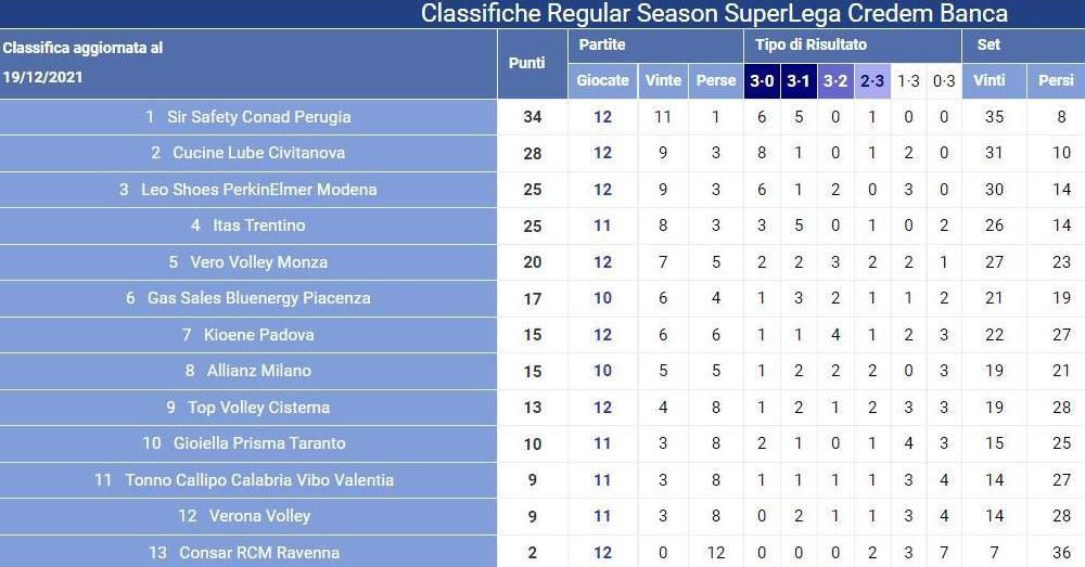Перуджа и лидер във временното класиране с актив от 34 точки (11 победи, 1 загуба). Лубе е на втора позиция с 28 точки (9 победи, 3 загуби).