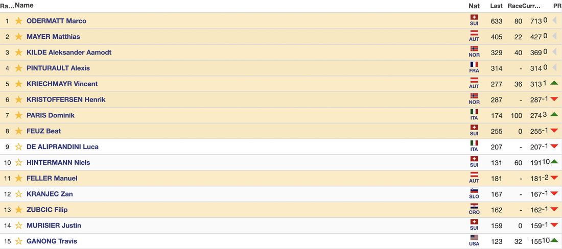 В генералното класиране за Световната купа лидер след края на 14-о от общо 36 състезания с актив от 713 точки е Одермат, следван от австриеца Матиас Майер, който днес завърши 12-и, с 427 пункта. Тройката с пасив от 344 точки затваря представителят на Норвегия Александър Омод Килде, който днес даде шесто време.