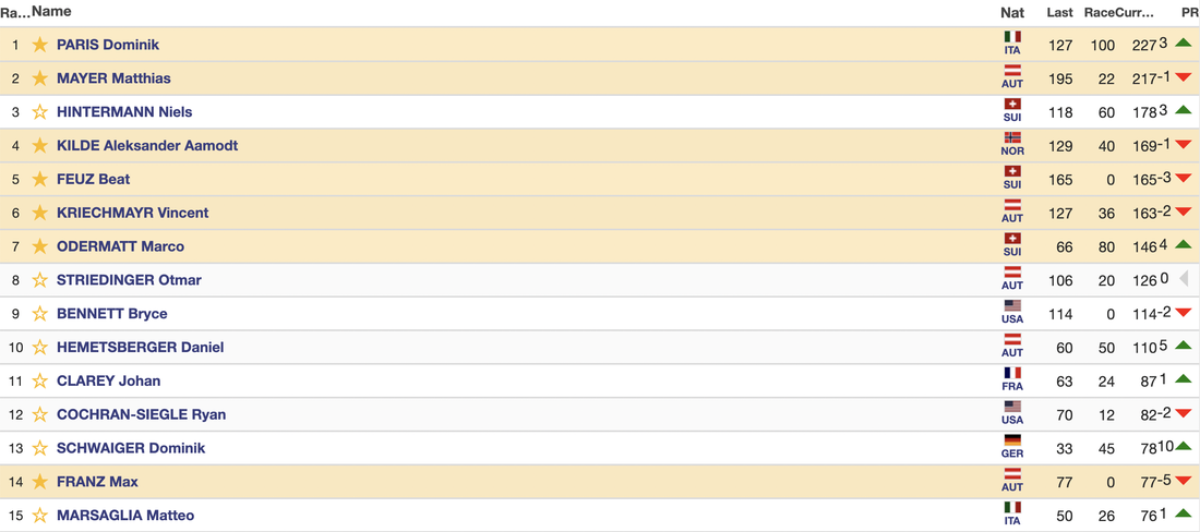 В битката за малкия кристален глобус начело с 227 точки е Парис, втори с 217 е Майер, а трети със 178 е Хинтерман.