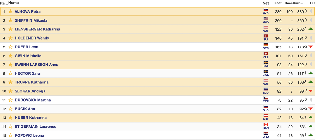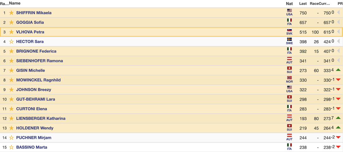 В генералното класиране за Световната купа начело, въпреки пропуснатите две надпревари, със 750 точки остава Шифрин, втора с 657 е италианката София Годжа, която също на участва днес. Победителката от слалома в Лиенц Влъхова е трета, като нейният пасив спрямо първото място е 155 точки.