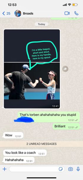 Броуди реши да се пошегува с шотландеца и попита защо на снимката му с Радукану бившият №1 в света е заел поза, наподобяваща чайник. Малко след това обаче той се поправи, казвайки, че на снимката всъщност е треньорът на Радукану – Торбен Белц. „Едва сега, осъзнах, че това е треньорът на Ема, а не Анди, ха-ха“ – написа Броуди.