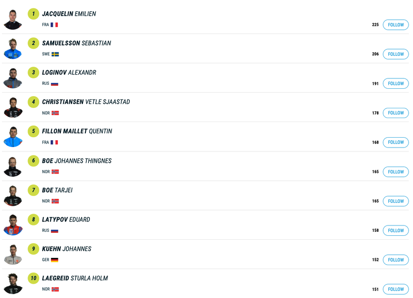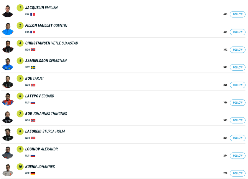 Начело в генералното класиране с актив от 425 точки остава Жаклен, втори с 401 е неговият сънародник Кентан Фийон Майе, който днес завърши девети с две грешки. Тройката с 372 затваря норвежецът Ветле Шастад Кристиансен, който днес се класира на 16-о място след два пропуска.