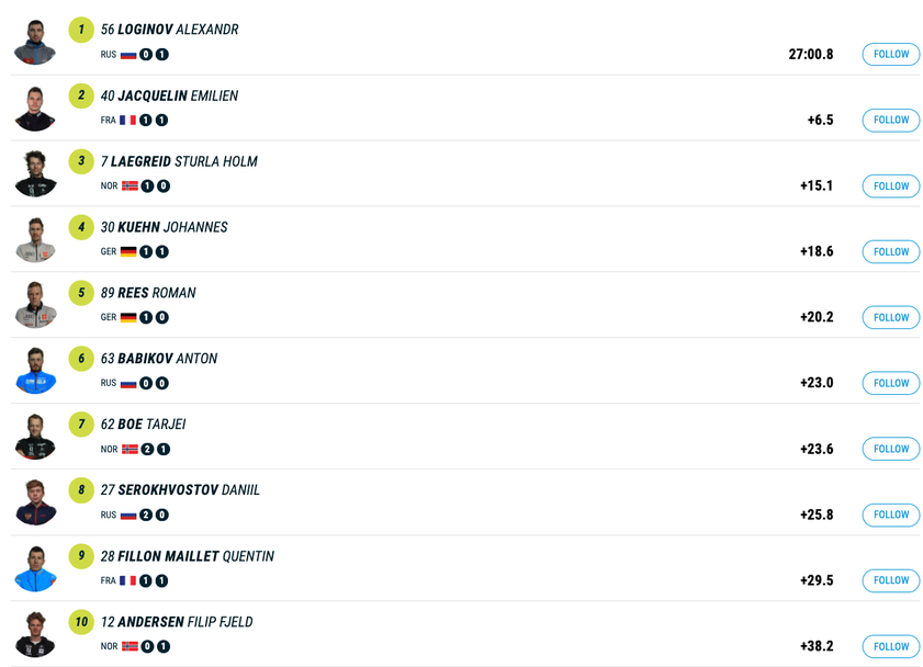 С време от 27:00.8 минути той бе с 6.5 секунди по-бърз от лидера в генералното класиране за Световната купа Емилиян Жаклен (Франция), който допусна две грешки. Трети с пасив от 15.1 секунди с един пропуск остана норвежецът Стурла Холм Легрейд, а петицата затвориха представителите на домакините Йоханес Кюн и Роман Реес, който направиха съответно по две и една грешки.