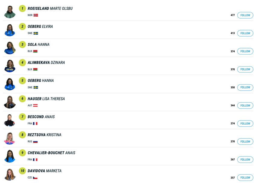 В битката за малкия глобус в спринта начело с 245 отново е Рьозеланд, която е следвана от двете белорускини Сола и Алимбекова с по 238 и 201 точки.