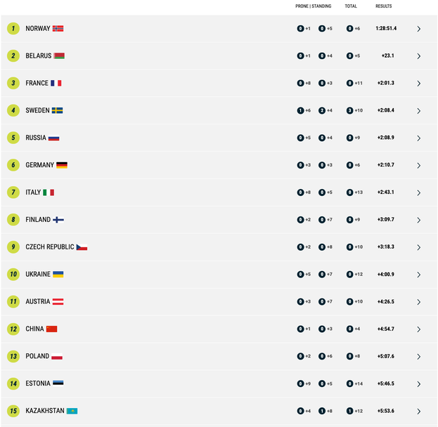 Ключов за „викингите“ беше вторият пост, на който Йоханес Тингес Бьо успя да отвори повече от 30 секунди преднина, въпреки че използва по един допълнителен патрон в двете си стрелби. Авансът беше задържан от Тандреволд, която имаше нужда само от един допълнителен изстрел във втората си визита на рубежа. Финалният пост започна бавно за Рьозеланд, но добрата ѝ стрелба донесе победа на Норвегия.