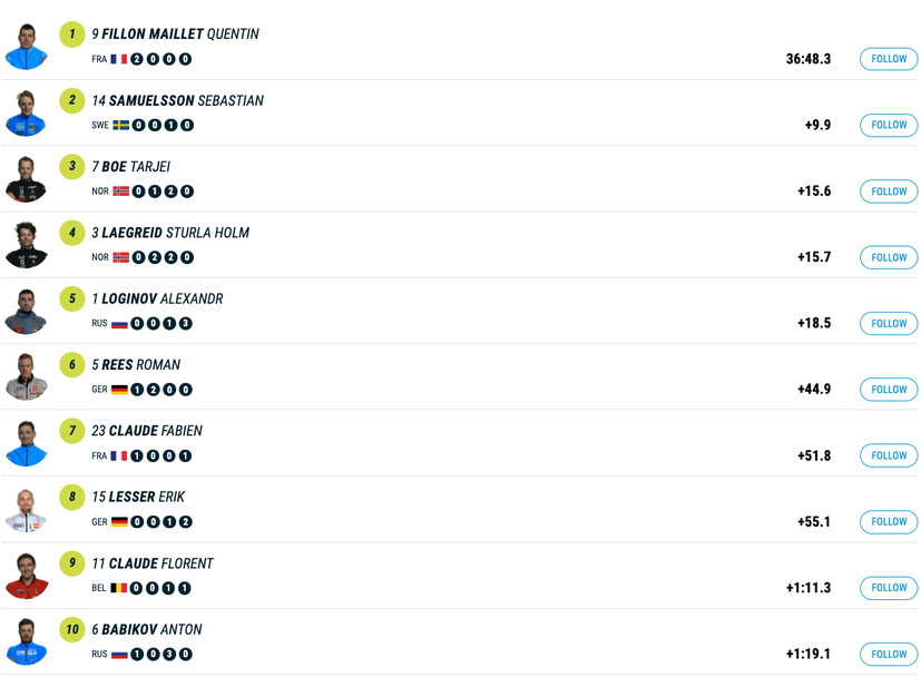 Победата в днешния ден буквално му бе подарена на французина от Александър Логинов (Русия), който допусна цели три грешки в последната си визита на рубежа. Преди това победителят от спринта свали 14 от първите си 15 мишени, но провалът на последна стрелба го прати чак на петата позиция на финала.